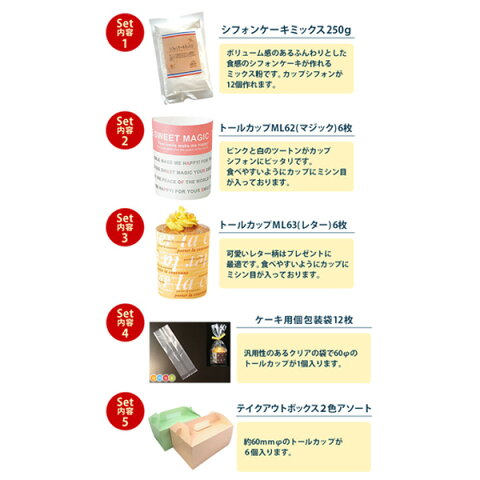商品コードcupchiffonset-1 商品名カップ シフォンスタートキット cupchiffonset-1 規格シフォンケーキミックス:250g×1袋/トールシフォンカップ:12枚/ラッピング袋:12枚/テイクアウトボックス:2枚 ●生産国:日本●賞味期限:45日以上 注意事項 ●オーブントースターや直火でのご使用はおやめ下さい。